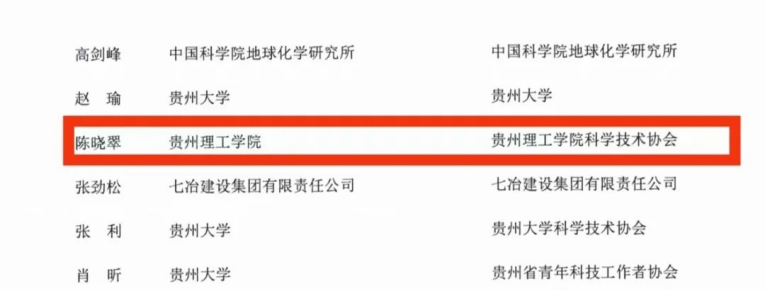 本网讯 日前,贵州省科学技术协会、贵州省人力资源和社会保障厅发布《关于表彰第二届贵州省优秀科技集体和优秀科技个人的决定》,资源与环境工程学院陈晓翠老师榜上有名,获“第二届贵州省优秀科技个人”荣誉称号。