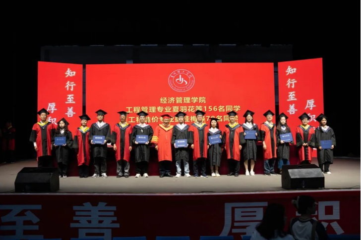 在学士学位授予仪式上,毕业生身着学士服依次走向主席台,接受校学位委员会扶正流苏、授予学位并合影留念。
