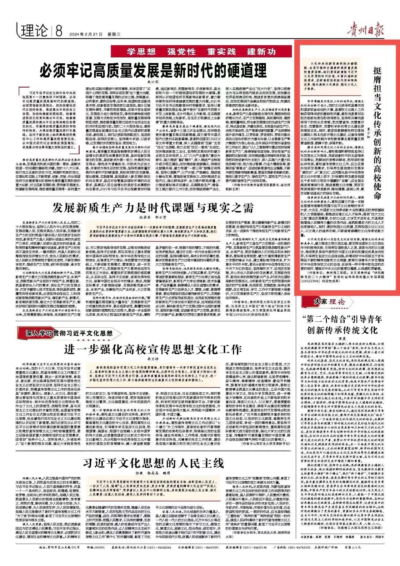?提升宣传思想文化工作的生动性,增强文化传承创新影响力。高校要旗帜鲜明地坚持以马克思主义为指导,用奋进新时代的主旋律来引导舆论,把鲜活的思想讲鲜活,把彻底的理论讲彻底。高校宣传思想文化工作,应立足贵州经济发展需求,引导师生围绕贵州发展学“真知识”、兴“真文化”;应挖掘弘扬中华优秀传统文化中的育人因子,引导高校师生感受我国五千多年的文明史中蕴藏的“至善”;应全面实施美育浸润行动,推进高雅文化传播,更好发挥美育提升审美素养、陶冶情操、温润心灵、激发创新创造活力的综合功能。??