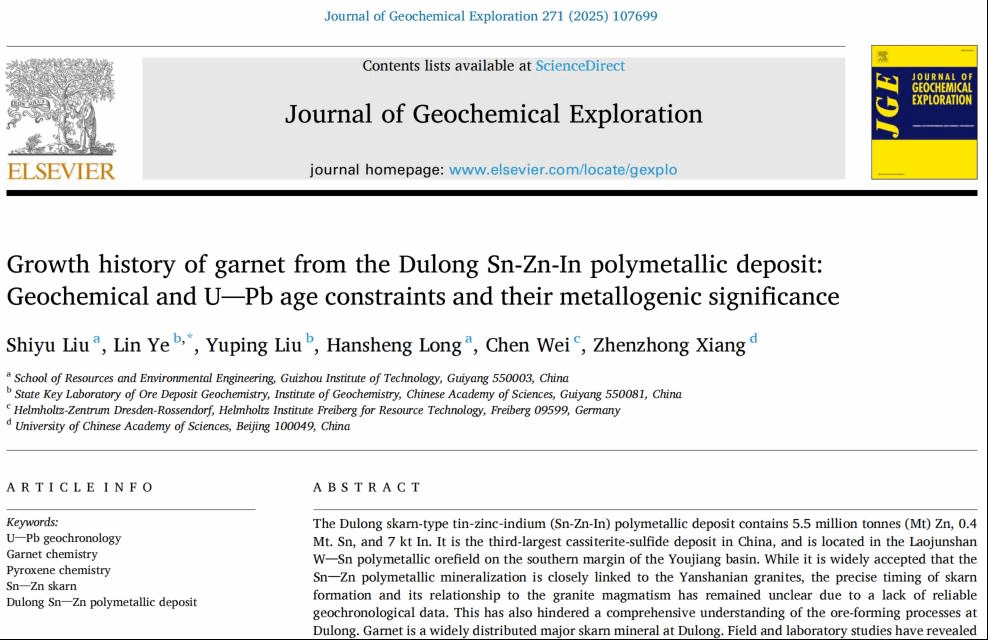 日前,贵州理工学院资源与环境工程学院刘仕玉老师以第一作者身份在国际勘探地球化学领域权威期刊《Journal of geochemical exploration》(JCR一区,中科院二区,影响因子IF=3.4)上发表题为《Growth history of garnet from the Dulong Sn-Zn-In polymetallic deposit: Geochemical and U-Pb age constraints and their metallogenic significance》研究论文,并被Web of Science数据库检索。
